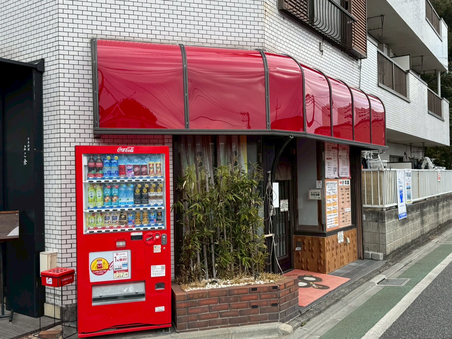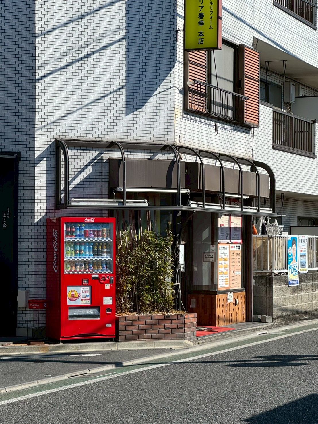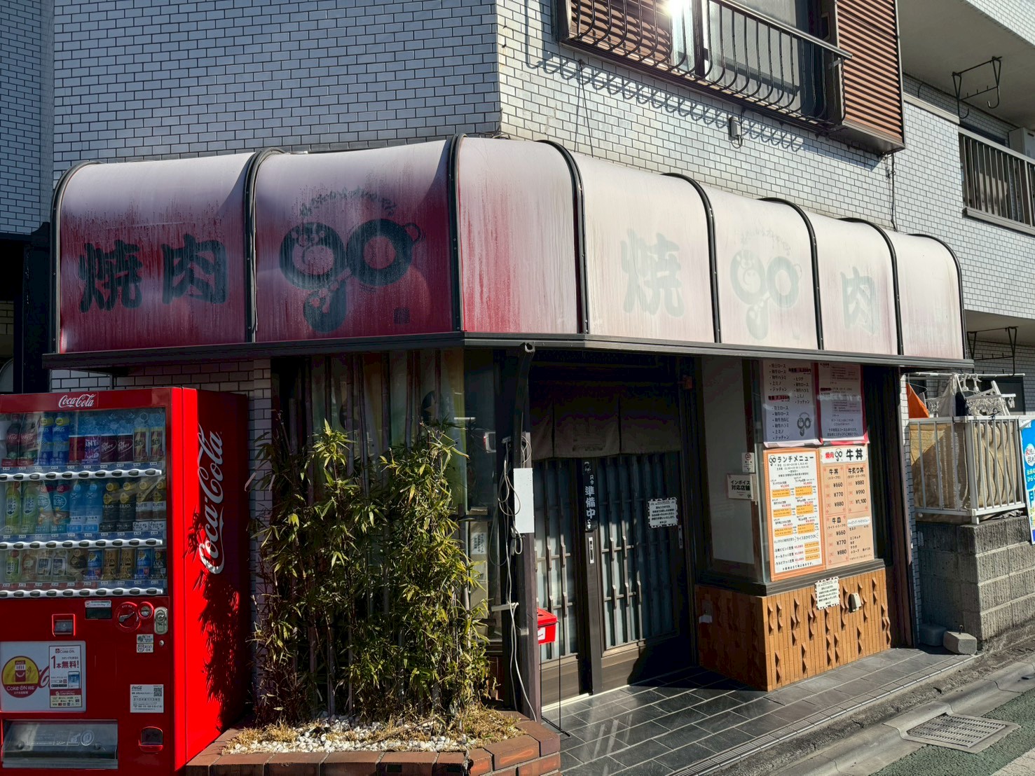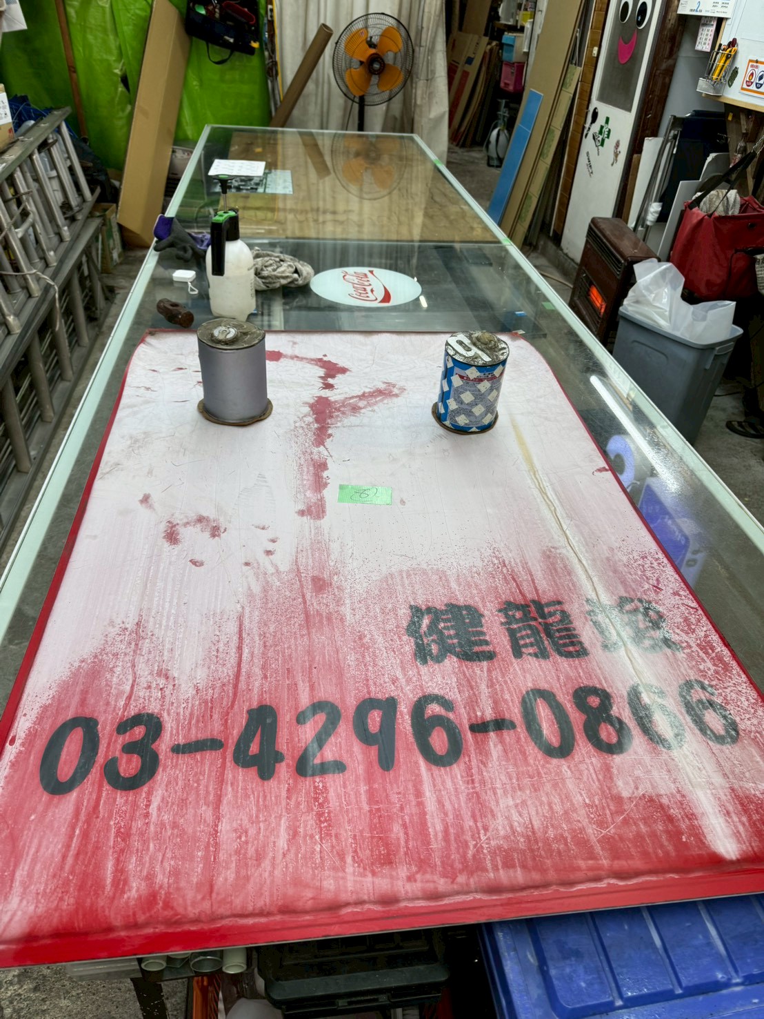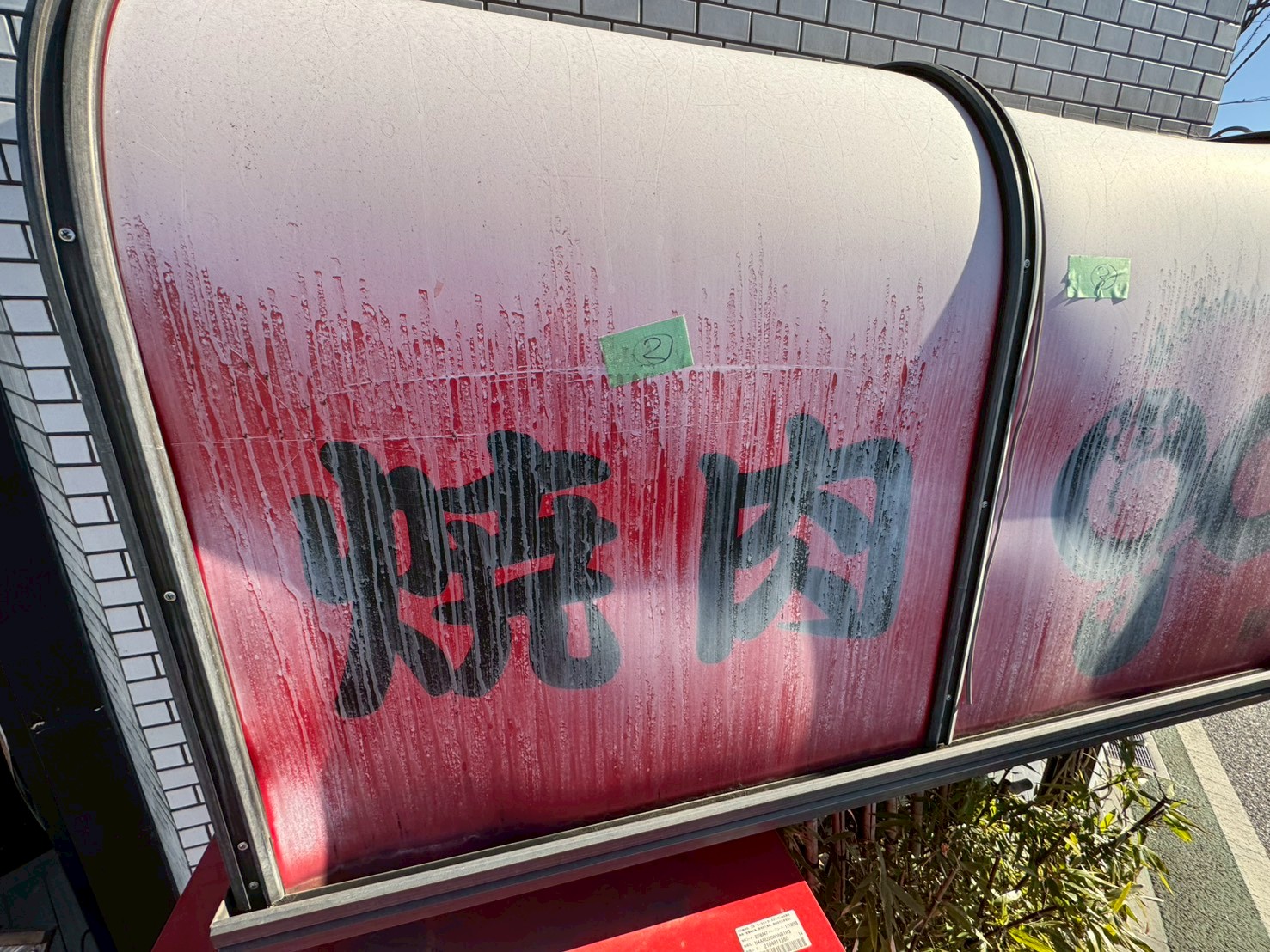 人見街道という歴史のある街道沿いにある焼肉屋さんのアクリルテントのアクリル板を丸ごと交換しました。このテント製作会社はすでになくなっていて、アルミ枠の交換はできないのですが、今回は枠は問題はなく、アクリル板のみを交換しました。赤いアクリル板は、色板と言って板に赤い顔料が練り込まれている素材で、赤いシートが貼ってあるわけではないのです。カッティングシートが存在しなかった昭和の頃は、この色板を文字やイラストの形に糸鋸(ミシン)でカットして、下地の乳半アクリル板に接着して看板を製作していました。その色板はカッティングシートやインクジェットシートの出現で需要が劇的に減り、取り扱っている販売店もあまりないのです。下見に行くと、板の劣化は著しく、白くなっていました。恐らく、どこに頼んでよいのかわからなかったのかもしれません。板を外して型を取り、その形にアクリル板をカットしてから納めました。