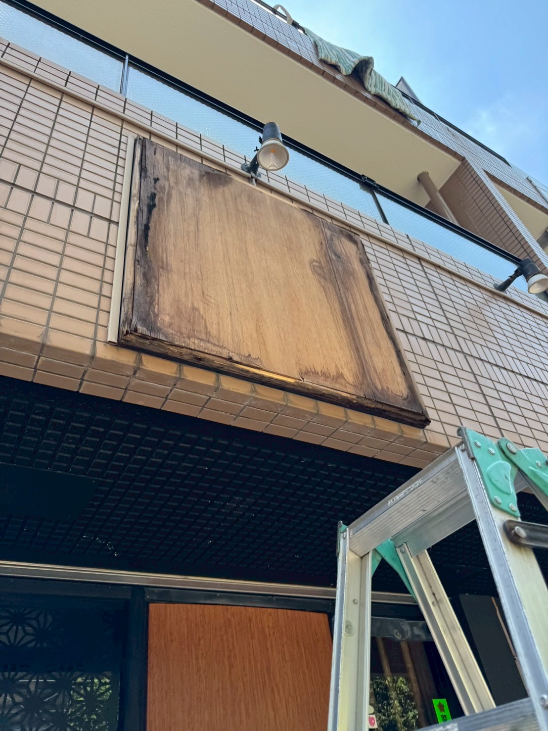三鷹駅の南側に広がる商店街にある居酒屋さんの正面パネル看板の交換です。お客様より、看板の下の枠が落ちて心配だという連絡を受けて下見にうかがいました。行ってみると、下のアルミ枠が取れていました。内部が木製だったため、朽ちてビスが抜けたため、枠が取れました。