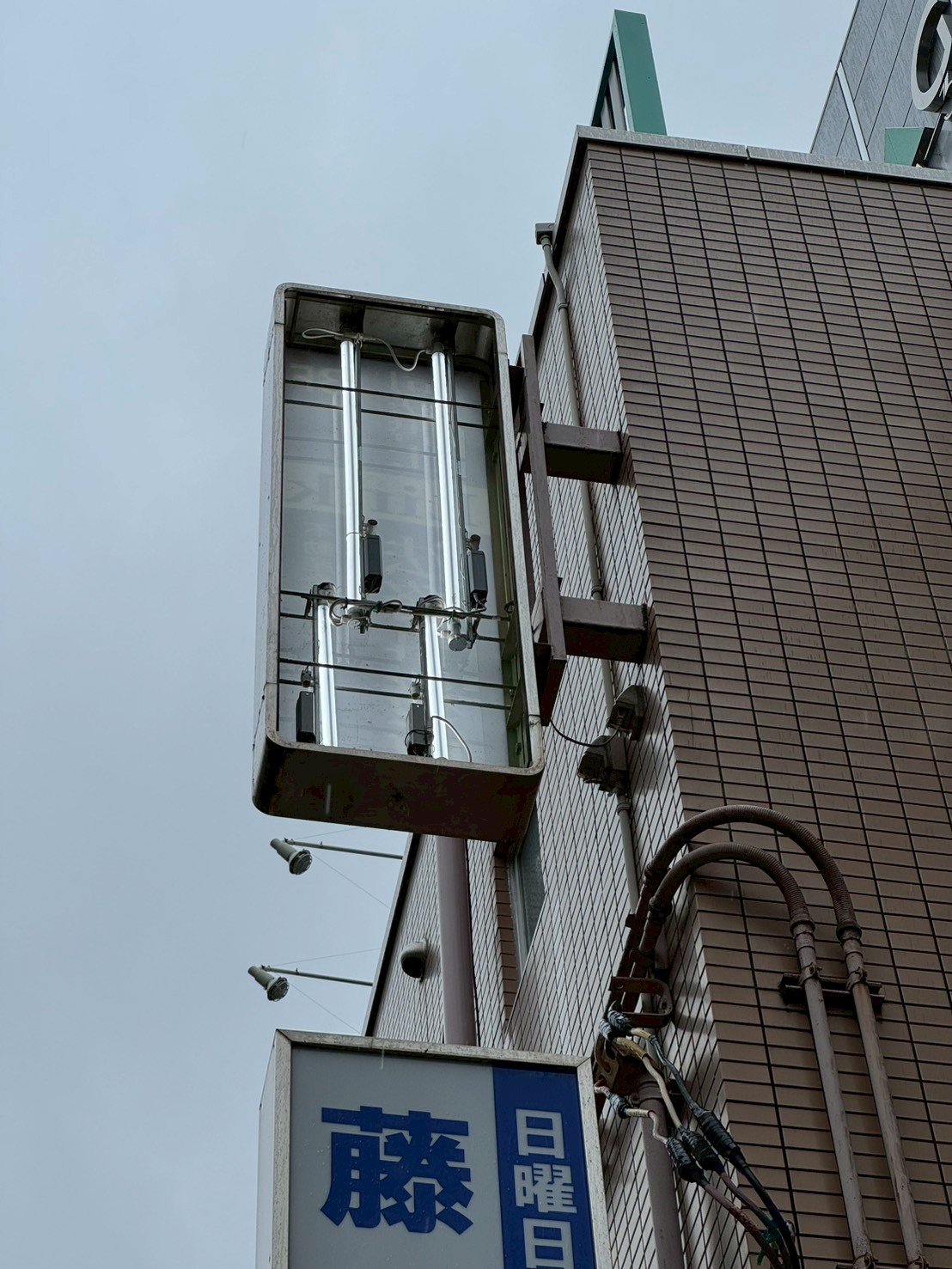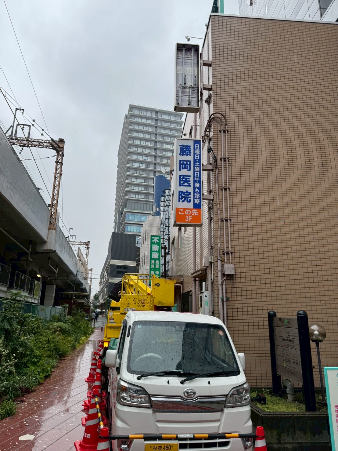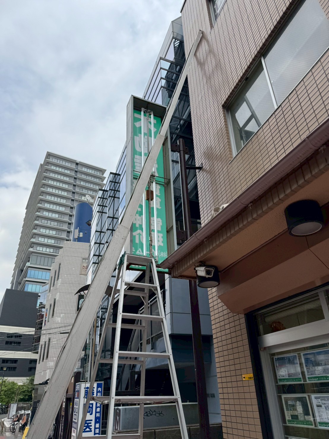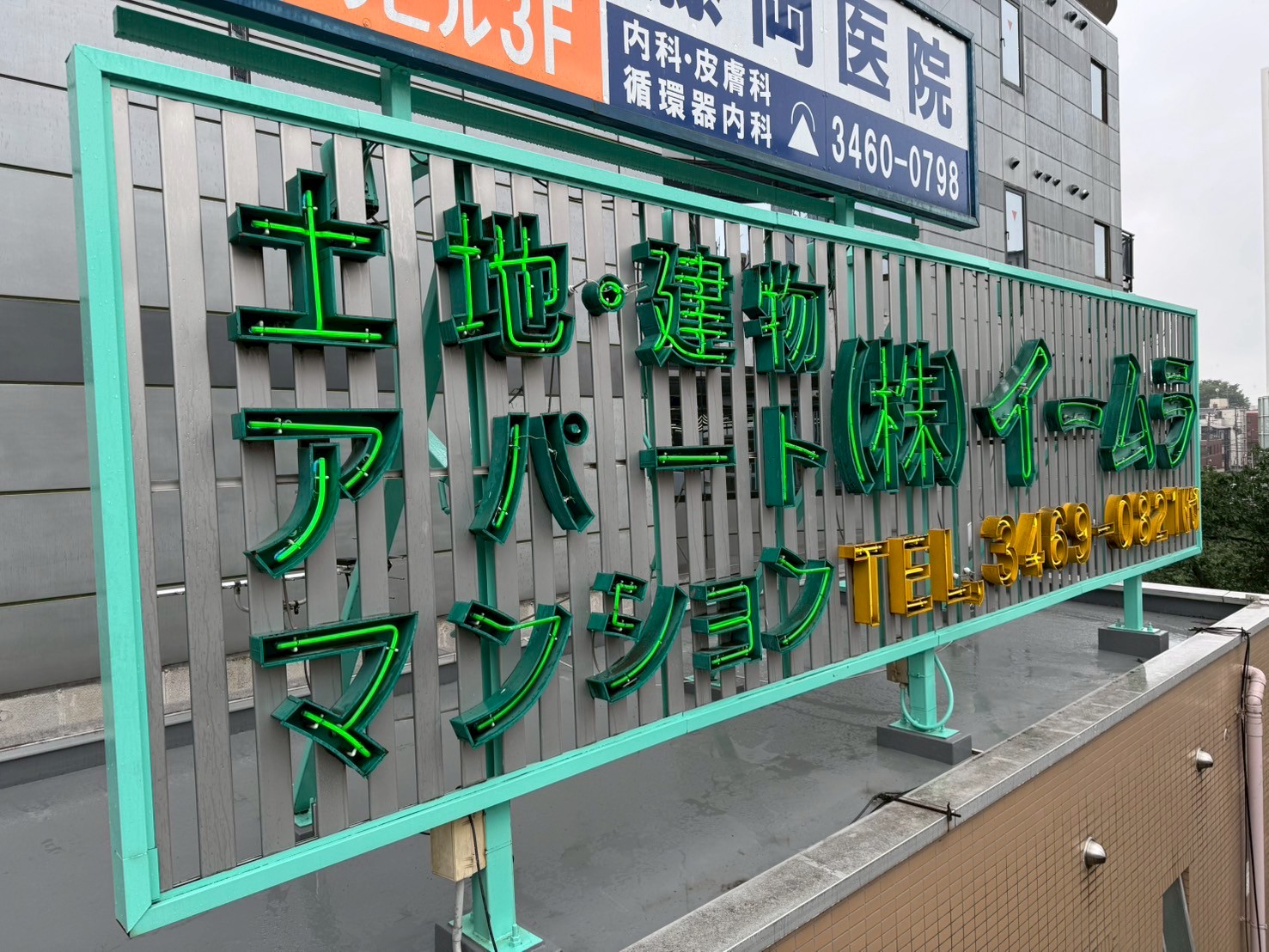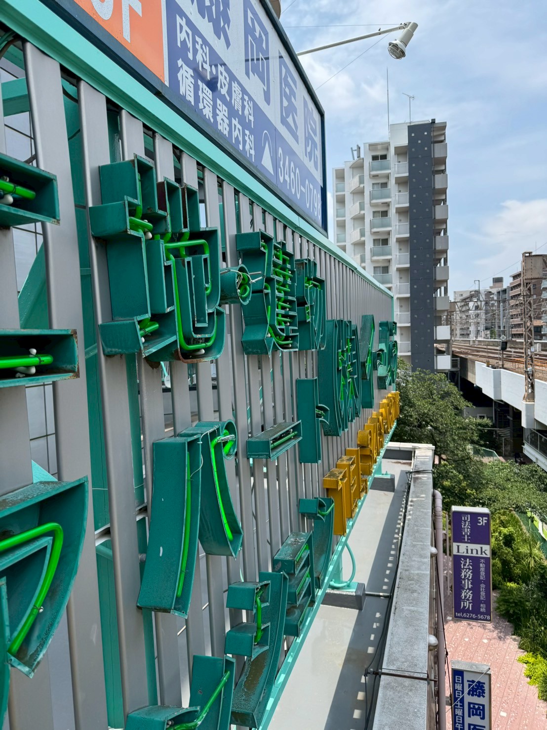 京王線笹塚駅横にある不動産屋さんの屋上ネオン看板補修と袖看板3台LED化工事を行いました。このあたりの京王線の線路は甲州街道にほぼ沿って走っていて、線路と甲州街道の間に商店街が詰まっている印象です。この笹塚は昔から栄えていた雰囲気が残っていて、居心地の良い街です。