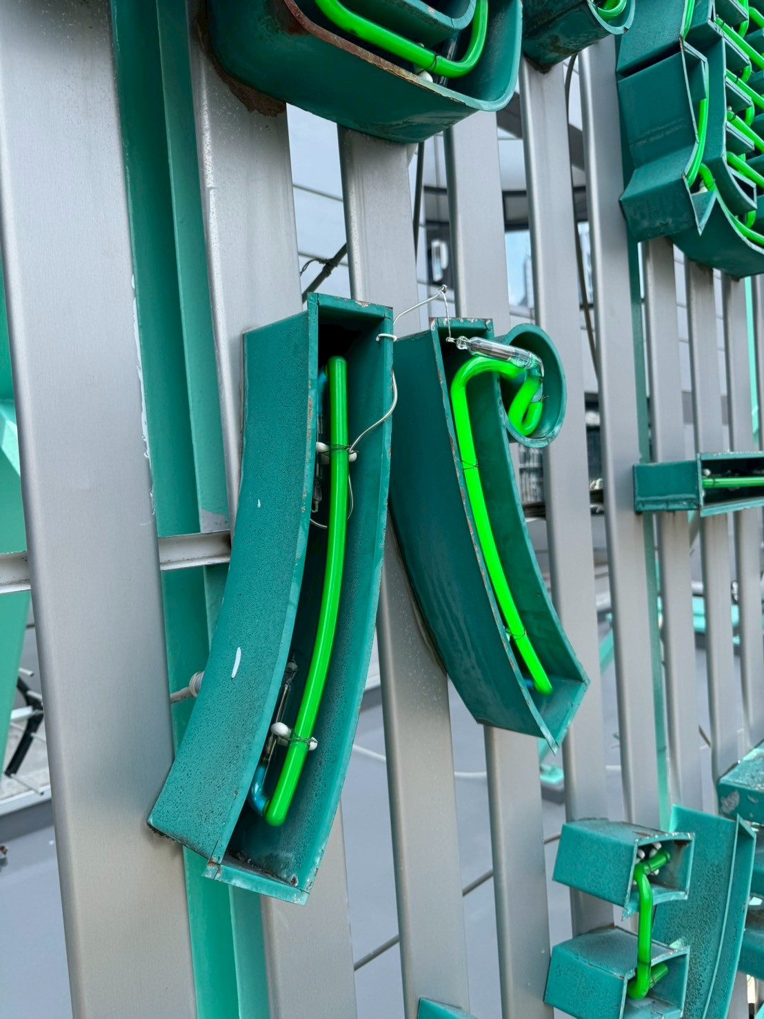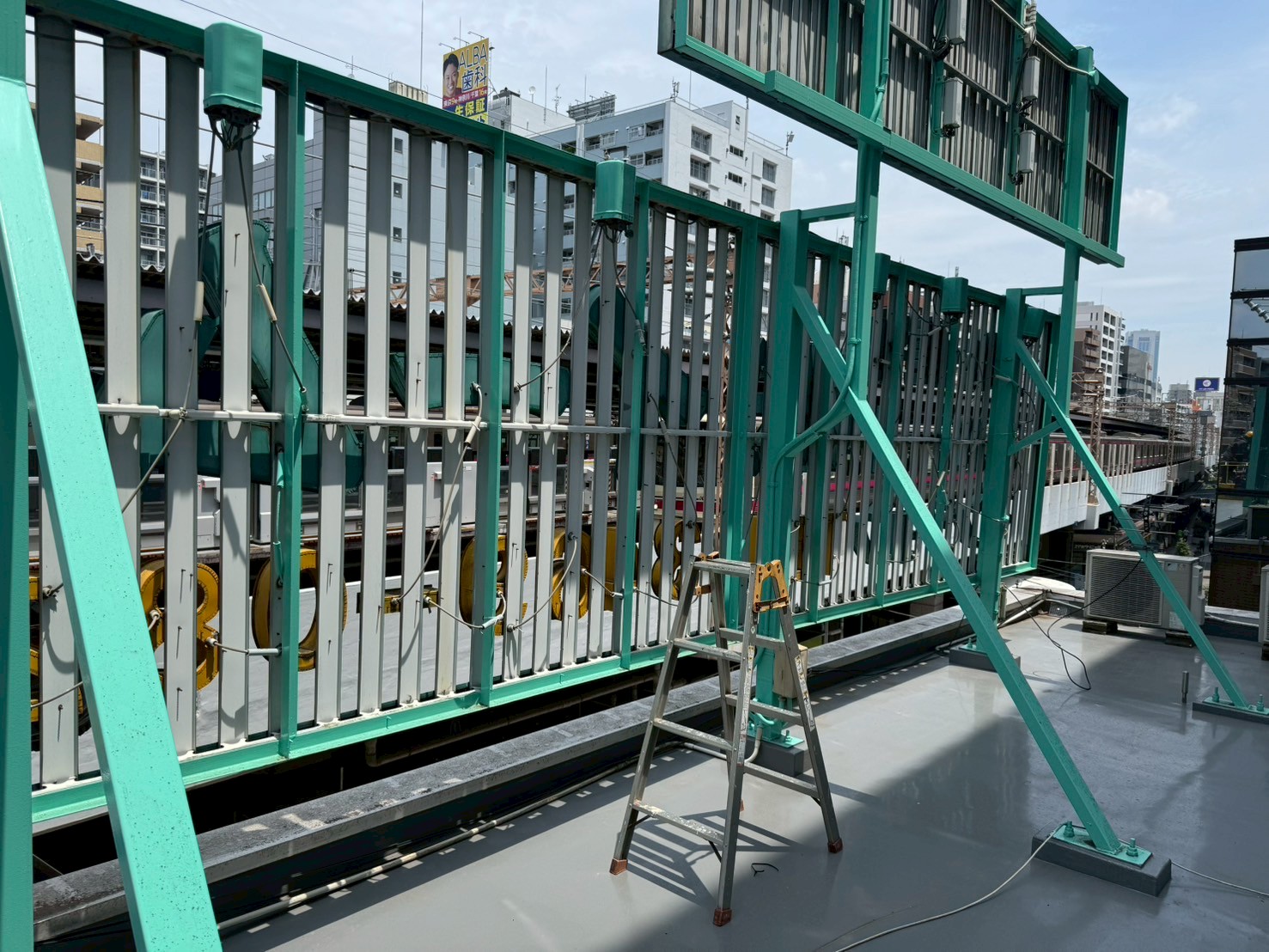 さて、この屋上看板は、駅のホームと同じ高さにあり、ホームからも電車からも良く見えます。ただし、この遊歩道は渋谷区が管理していて、入口の柱を鍵で外さないと中に車両が入れません。高所作業車を入れても、歩行者が通行できることを確認して、ようやく作業を行う段取りが組めました。袖看板3台のLED化工事は特に問題はなく、ネオン看板についてはネオン管が故障しているのか、配線に問題があるのか調査するのに時間がかかりました。結局「ア」と「パ」の2本のネオン管が故障していることが判明し、全点灯することができました。