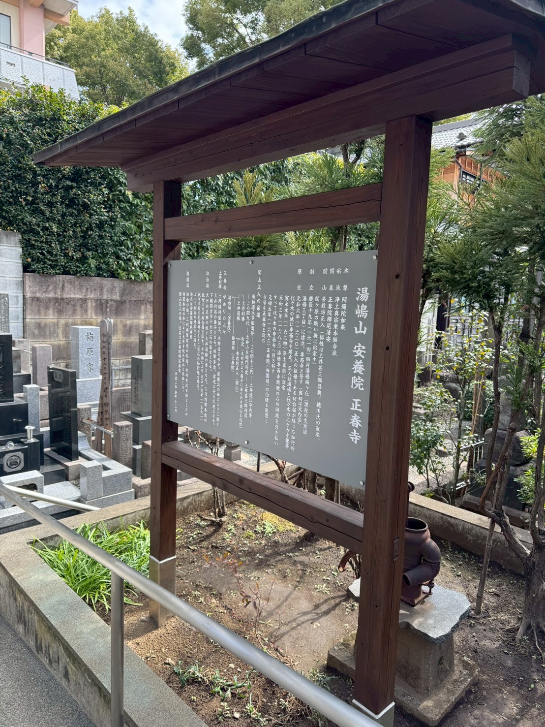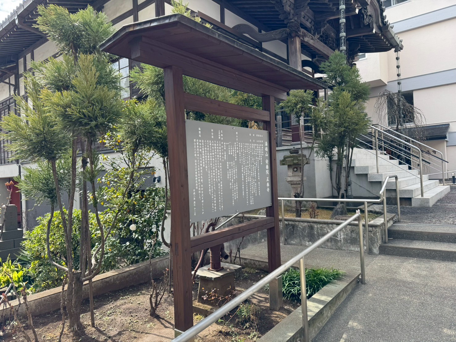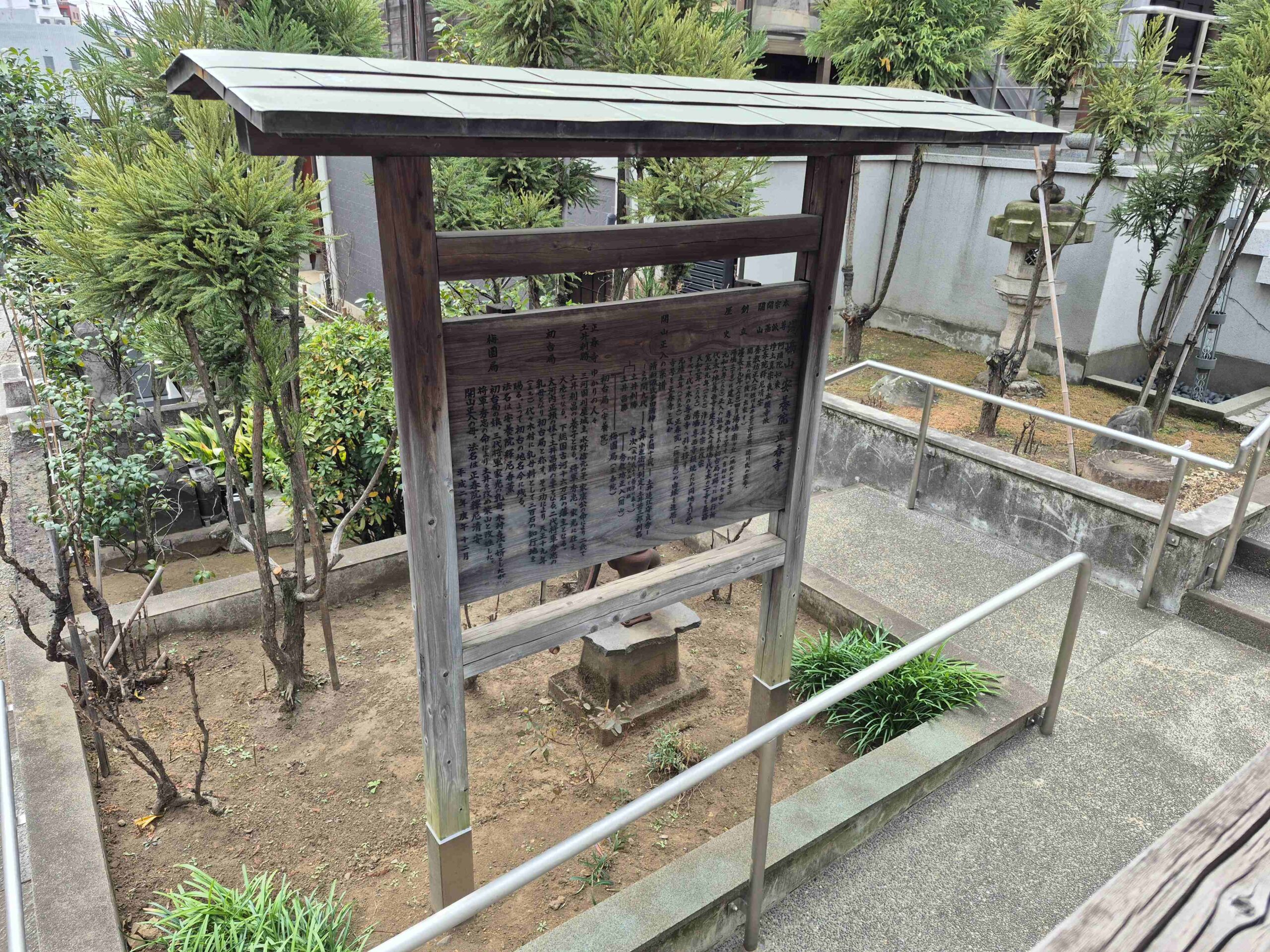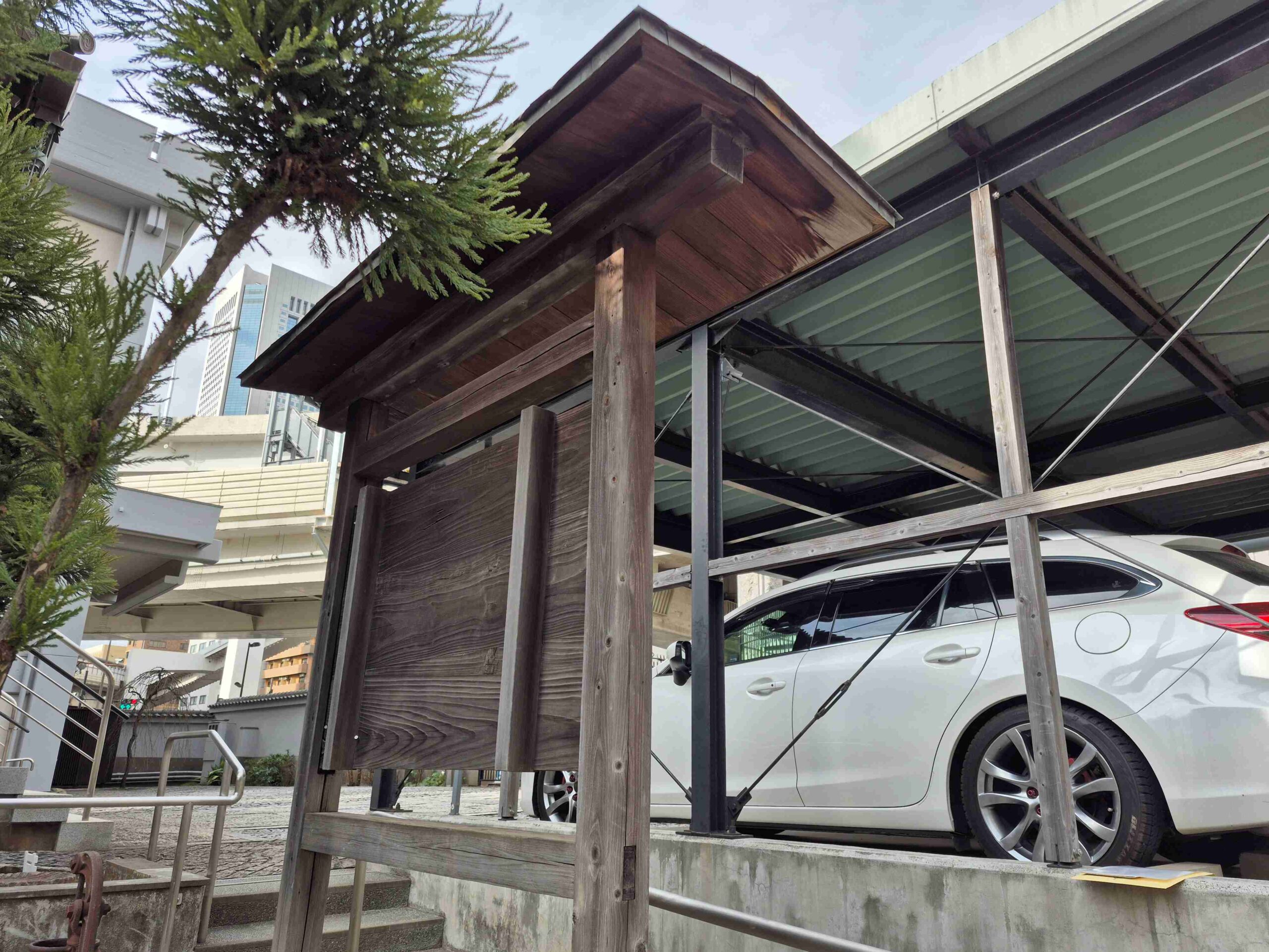 甲州街道を都心に向かって上を走る首都高速に沿うように南に曲がって明治神宮方面に向かうその角にあるお寺で、由来を記した木製自立案内板の補修です。2本の柱の根元がしっかりしていることから、新規ではなく補修で対応可能と判断しました。まずは、アク洗いと言って、基本的に水洗いで木材表面の汚れを落とします。これにより木目がきれいに出て、さらに下塗りの浸透性が上がります。下塗りを時間をおきながら2回行い、本塗りはキシラデコール塗装(ウォールナット)を行いました。キシラデコールは通常の塗料よりも、木目がきれいに残ります。看板部分は、アルミ複合板にインクジェットシート全面貼りにして、飾りビスで固定しました。ベースはグレーで、白文字の組み合わせです。一方、屋根は銅の板金仕上げで、緑青が出てきているので、あえて塗装はせずにそのままの風合いを活かすこととしました。